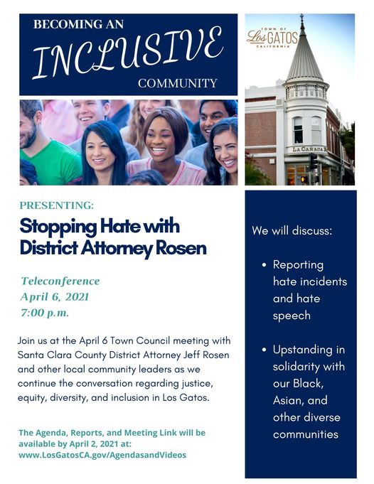 The Council had a discussion with Santa Clara County District Attorney Jeff Rosen and other local community leaders, heard public testimony, and discussed the importance of standing together in solidarity and respect during this time of divisiveness. The Council also authorized the Town Manager to issue a Request for Proposals to hire a consultant to assist with the Town's Justice, Equity, Diversity, and Inclusion Work Plan and adopted a Resolution denouncing hatred and violence toward diverse Los Gatos communities. The staff report and meeting minutes are available on the Town website and a full video recording of the Council meeting is available on the Town YouTube page.